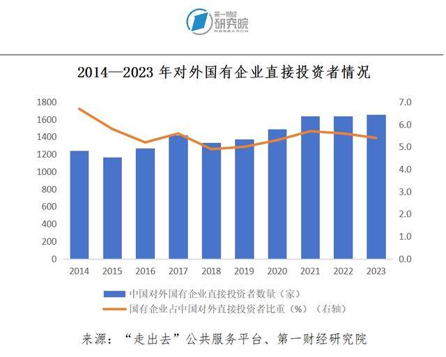 2014—2023年,中国对外直接投资主体中,国有企业数量基本上呈持续上升走势。在“国内国际双循环”提出的2020年以及随后的2021年,明显有更多的国有企业加入了对外直接投资的行列,进行对外直接投资的国有企业数量由2019年的1373家较显著地增加至1491家和1640家。同样在这两年中,国有企业占中国对外直接投资者比重持续回升至5.7%。随后的两年中,进行海外投资的国有企业数量快速上升的趋势有一定停滞,相较于2021年,2022年和2023年变化相对较小,分别为1641家和1654家。需要一提的是,由于2025年9月发布的《2024年度中国对外直接投资统计公报》未公布上述细分数据,因此本文仅对2014年至2023年的数据进行观察。