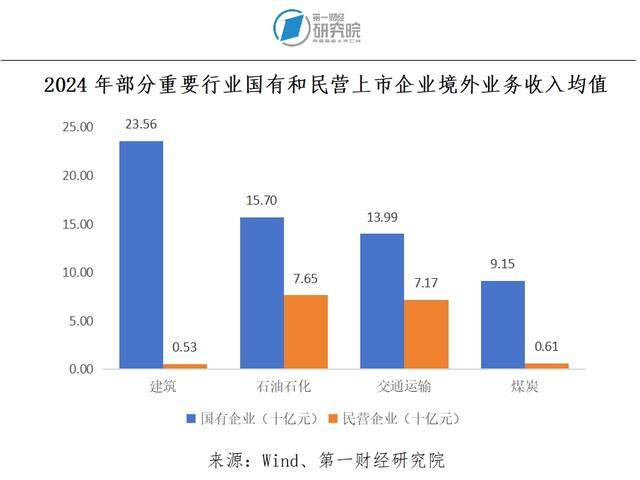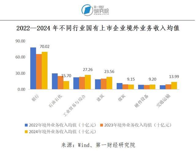 文献《战略、管理、风控及本地化——国企出海的破局之路》显示,2005—2021年,国有企业出海主要集中于重资产行业,如能源、原材料、交通等。我们根据Wind二级行业分类,观察不同行业国有上市企业的全球化销售表现,得到了类似的结论。2022—2024年,银行、石油石化、工业贸易与综合、建筑、煤炭、硬件设备以及交通运输行业的上市国有企业境外业务收入均值均高于总体上市国有企业境外业务收入的平均水平。这些行业的国有上市企业在海外销售方面表现突出。