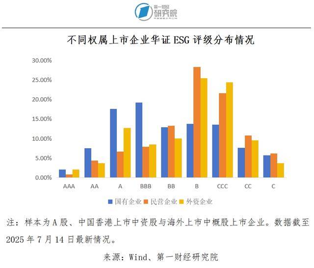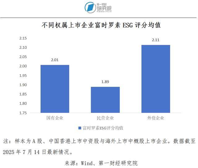 合规经营颇为重要,而这也是企业履行社会责任的一部分。普遍来说,较好地履行社会责任能够帮助企业在全球范围内建立信誉。国有企业经营的规范性相对较好,且较早就关注社会责任的履行。早在2008年国务院国资委即发布了《关于中央企业履行社会责任的指导意见》;2015年发布的《中央、国务院关于深化国有企业改革的指导意见》也提到,“社会主义市场经济条件下的国有企业,要成为自觉履行社会责任的表率”;2024年《关于新时代中央企业高标准履行社会责任的指导意见》发布,对中央企业履行社会责任提出了更高的要求。在这样的背景下,国有企业普遍积极地履行着社会责任。从华证ESG评级数据来看,2.06%被评级的上市国有企业获得了AAA(最高)级别,46.39%的国有企业被评为BBB级及以上,这两个比重均高于民营企业和外资企业。仅19.83%和26.98%的被评级上市民营企业和外资企业被评为BBB级及以上。从富时罗素ESG评分来看,满分为5分,上市国有企业的平均得分为2.01分,高于民营企业(1.89分)。积极履行社会责任直接支持着国有企业开展国际合作,推动企业全球化。