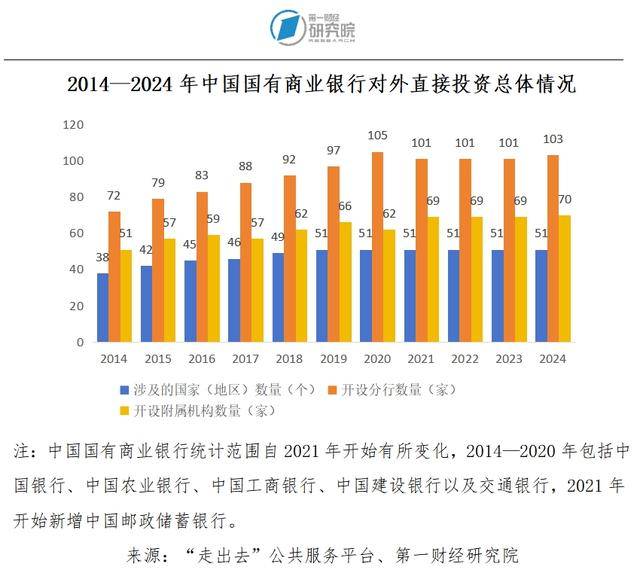 除此之外,2014—2020年,中国国有商业银行持续进行海外投资,广泛布局,海外服务能力持续增强。2020年末,中国国有商业银行在海外开设分行数量由2014年末的72家上升至105家。在中国邮政储蓄银行加入统计样本后的2021—2024年,国有商业银行的海外投资布局则没有太大的变化。这些银行的海外本土化经营同样值得关注。2021—2024年数据显示,这些国有商业银行雇佣外方员工占比维持在92%以上。