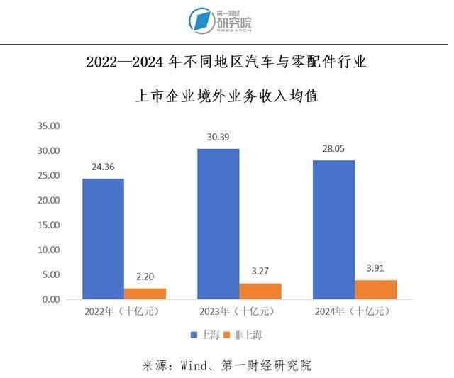 当前,上海拥有7家处于汽车与零配件行业的上市国有企业,数量与江苏省相同,显著多于其他省份及直辖市。就该行业而言,Wind数据显示,2022—2024年,与非上海地区相比,上海上市国有企业有着明显更高的境外收入规模均值,显示上海汽车与零配件行业的上市国有企业在全球市场上有着显著较强的全球竞争力。其中的上汽集团、华域汽车系统股份有限公司(简称“华域汽车”)以及上海申达股份有限公司(简称“申达股份”)是拉高均值的主要因素。这三家企业分别成立于1984年、1992年和1986年,是有着较长发展历程的大型上市国有企业。在较早期在国内市场形成了一定的规模后,它们纷纷来到海外市场进行销售,业务体量大也使得它们相对容易拥有较大的海外收入规模。